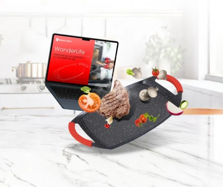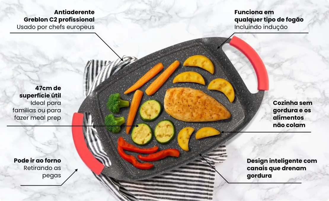 Esquece usar vários tachos para cozinhar apenas uma refeição, com o WonderGrill tens 47cm de superfície para cozinhar tudo de uma vez só. Dispensa o uso de gordura e limpa-se só com um pano.